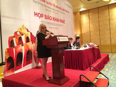 Bà Colleen Camp, nhà sản xuất, diễn viên Hollywood phát biểu tại Họp báo. (Ảnh: PV/Vietnam+)