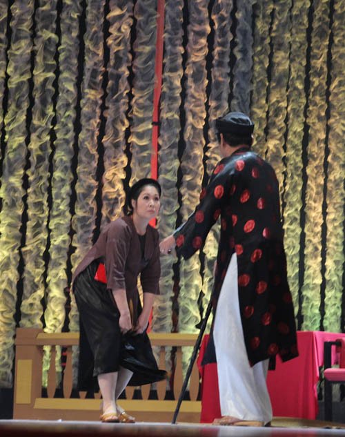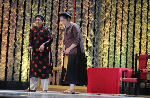 NSƯT Đức Thịnh và NSND Hồng Vân trong tiểu phẩm "Người, câm, điếc, mù, dốt xử án"
