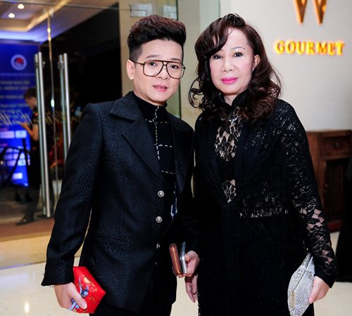 Vợ chồng danh ca Cẩm Vân, Khắc Triệu ton sur ton mang quà đến tặng ông hoàng nhạc Việt.