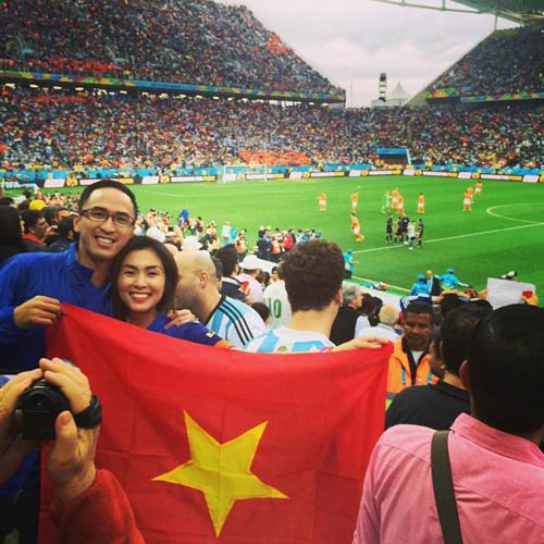 Tăng Thanh Hà và chồng hạnh phúc trên khán đài. Cặp đôi không quên mang theo lá cờ đỏ sao vàng tới sân vận động ở Sao Paulo.