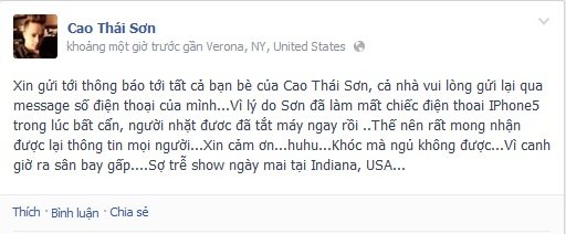 Vì bị mất điện thoại, mất liên lạc nên Cao Thái Sơn thông báo nhanh chóng tới tất cả bạn bè để có thể nhận được thông tin sớm nhất từ phía mọi người: "Xin gửi tới thông báo tới tất cả bạn bè của Cao Thái Sơn, cả nhà vui lòng gửi lại qua message số điện thoại của mình...Vì lý do Sơn đã làm mất chiếc điện thọai IPhone5 trong lúc bất cẩn, người nhặt đươc đã tắt máy ngay rồi... Thế nên rất mong nhận được lại thông tin mọi người... Xin cảm ơn...huhu...Khóc mà ngủ không được...Vì canh giờ ra sân bay gấp....Sợ trễ show ngày mai tại Indiana, USA..."