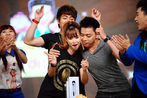 Là con gái, nhưng Khởi My đảm nhận vị trí đầu tiên với nhiệm vụ phải ăn hết các ly kem to trong thời gian ngắn nhất.