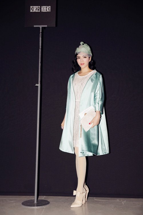 Kiều nữ khoác một chiếc áo khoác màu xanh dịu nhẹ, mang phong cách cổ điển, quý phái của thương hiệu Roksanda Ilincic ton sur ton với chiếc nón đội phong cách hoàng gia hiệu Celine Robert, bên trong áo khoác mỏng, kiều nữ diện chiếc đầm ren trắng tinh tế của thương hiệu Erin Fetherston (Mỹ) được mix với thắt lưng nhỏ xinh của Georges Hobeika có màu sắc ton sur ton với chiếc bóp cầm tay hiệu Marchesa….
