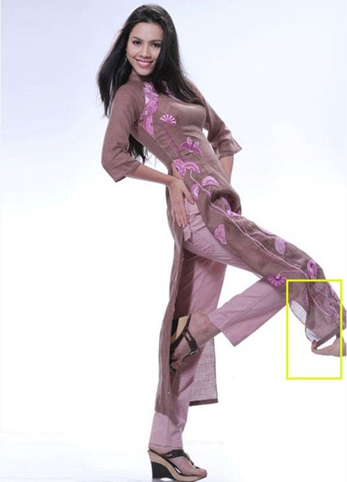 Ngọc Trinh từng khiến cộng đồng mạng xôn xao với bức ảnh bị mất chân trái. Đây là lỗi photoshop mà nhiều ê-kíp quốc tế cũng mắc phải.