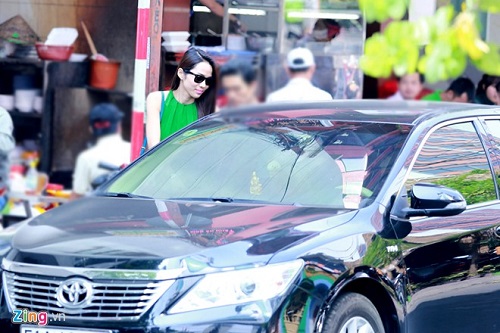 Người đẹp nhanh chóng ra về và tiến đến chiếc xe hơi sang trọng đang đậu bên lề đường. Đây là chiếc xe quen thuộc mà Ưng Hoàng Phúc thường xuyên sử dụng khi đi diễn trong thành phố.