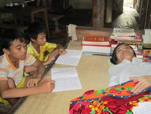 Hơn 30 năm nay, thầy Thắng vẫn nằm dạy học trên chiếc giường nhỏ bé, đơn sơ. (Nguồn Internet)