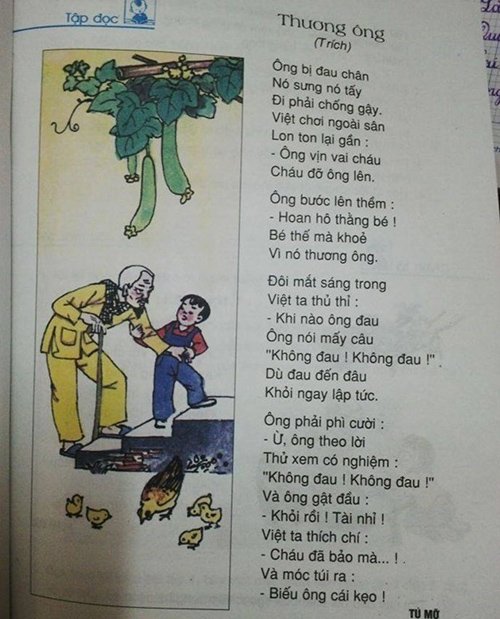 Bài Thương ông trong SGK cũ, tuy là dạy cho lớp 4 nhưng cũng chỉ dạy trích đoạn, chứ không dạy trọn bài. Chỉ có điều phần trích trong sách cũ có những từ ngữ không đảm bảo chuẩn mực tiếng Việt do ép vần (ví dụ: “khập khiễng khập khà”) và những câu khá “nôm na” (ví dụ: “bước chân quá khó”; “trong lòng vui sướng”…).
