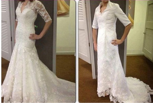 Phim ảnh và thực tế hoàn toàn khác xa. Thay vì nhận được bộ váy cưới có phần ống tay ren gợi cảm thì cô dâu này lại nhận phải bộ váy cưới có phần ống tay khác xa, chưa kể thiết kế không hề ôm dáng.