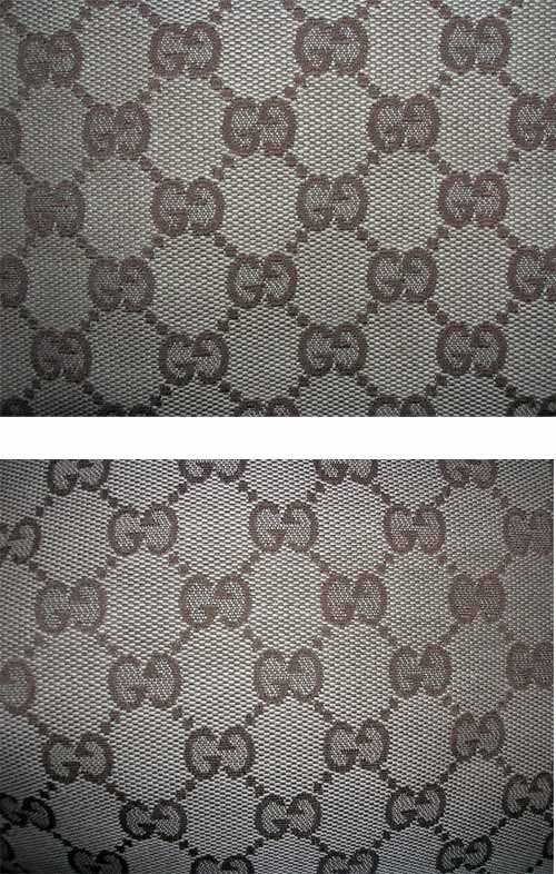 Chất liệu vải canvas truyền thống của Gucci thật (ảnh trên) không mờ và "dại" như Gucci fake (ảnh dưới).