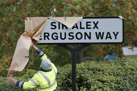 Đoạn đường dẫn đến sân Old Trafford mới được đổi từ Waters Reach thành Sir Alex Ferguson hồi đầu tuần này. Ảnh: Reuters.