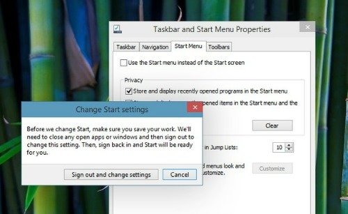 Hộp thoại tùy chỉnh Taskbar and Start Menu Properties xuất hiện, bạn hãy chọn tab Start Menu và bỏ đánh dấu ở tùy chọn Use the Start menu instead of the Start screen và nhấn OK.