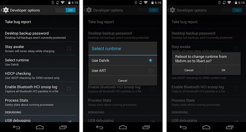 Để chuyển từ Dalvik sang ART, trên các máy KitKat, bạn có thể tìm thấy nó ở trong phần Settings > Developer Options > Select Runtime (một số máy dùng ROM cook có thể không có, và việc kích hoạt nó lên có thể khiến hệ thống và ứng dụng gặp lỗi đấy nhé).