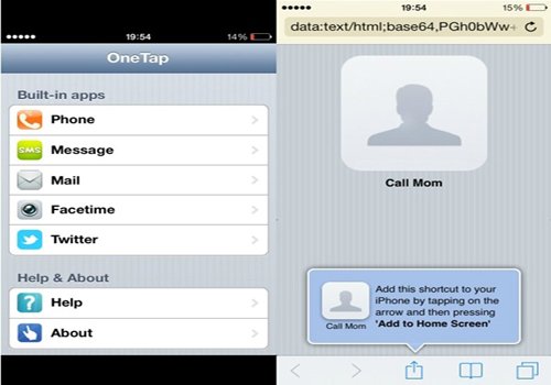 Để thực hiện, kích hoạt OneTap lên rồi chọn chức năng muốn sử dụng như: Gọi (phone), nhắn tin (Message), Mail, FaceTime hoặc địa chỉ liên lạc Tweet. Đối với mỗi một địa chỉ liên lạc, OneTap sẽ tạo ra một URL dài để mở trong trình duyệt Safari. Chỉ cần nhấp vào biểu tượng Share và nhấn Add to Homescreen để tạo ra các biểu tượng quay số nhanh. Chức năng này cũng vẫn sẽ hoạt động ngay cả khi không có kết nối Internet.