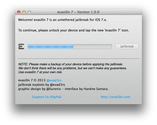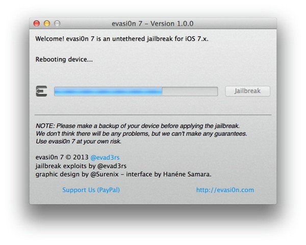 Công cụ mới này có tên evasi0n7, hỗ trợ chạy trên nền Windows và Mac OSX. Công cụ này có thể jailbreak hoàn toàn (Untethered), tuy nhiên nhiều người dùng đã gặp phải tình trạng "treo táo" khi máy khởi động lần cuối cùng. Những người dùng này đều nâng cấp lên phiên bản iOS hiện tại thông qua OTA (nâng cấp trực tiếp trên thiết bị).