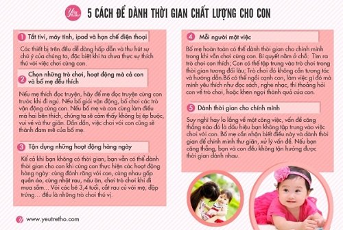 Bố mẹ nào cũng ước có thêm thời gian cho con mình. Nghiên cứu lại cho thấy, trẻ em không cần bố mẹ có thêm nhiều thời gian hơn cho chúng, mà là thời gian chất lượng. Các con muốn bố mẹ thư giãn, vui vẻ, muốn cảm nhận được sự quan tâm và tình yêu thương của bố mẹ khi chơi cùng con. Điều này giúp con hạnh phúc và phát triển trí tuệ cảm xúc.