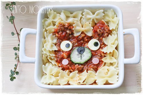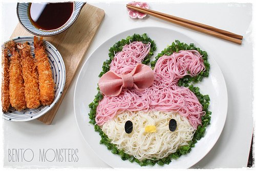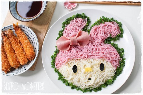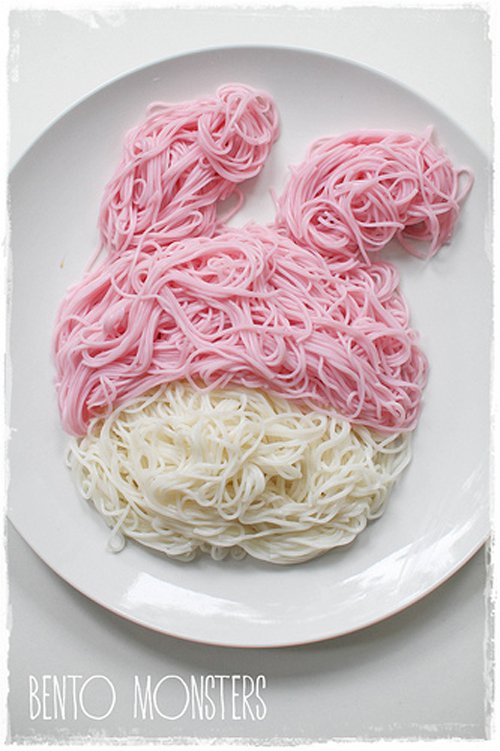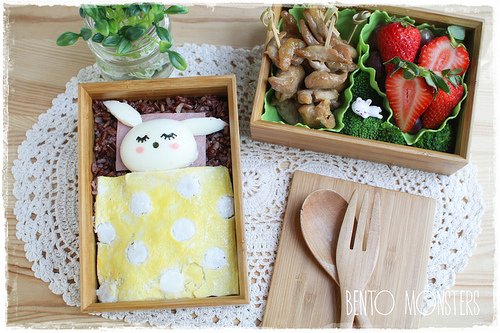 Thỏ được làm từ trứng luộc và rong biển. Chú thỏ đang nằm trên một chiếc gối là thịt nguội, còn chiếc giường là gạo lứt. Chăn của thỏ được làm từ trứng rán.