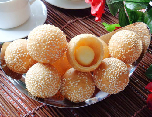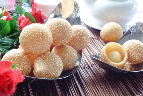 Bước 6: Khi viên tròn xong thì cho viên bột vào tô mè trắng lăn tròn cho mè bám quanh viên bột, cứ tiếp tục viên từng viên bột có nhân và xếp ra dĩa.