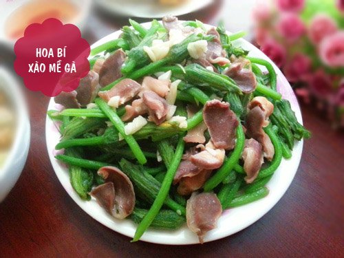 Phi thơm 1 nửa hành tỏi khô, cho mề gà lên đảo cùng, nêm gia vị vừa ăn. Mề gà săn lại thì chút ra đĩa. Cho nốt chỗ hành tỏi còn lại lên chảo phi thơm. Cho hoa bí vào xào cùng, thêm chút nước, nêm gia vị vừa ăn. Tuỳ vào sở thích mỗi người mà có thể xào rau chín tái hoặc chín tới. Khi rau ngấm đều gia vị thì cho mề gà vào đảo cùng khoảng 1 phút thì cho ra đĩa.