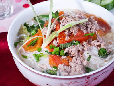 - Chia bún ra bát, rắc hành mùi lên trên, chan nước canh vào dùng nóng.