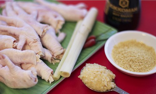 - Phi thơm dầu với tỏi và sả băm. Cho chân gà vào, xào sơ rồi cho nước tương, hắc xì dầu, đường vào xào đến khi chân gà thấm gia vị.