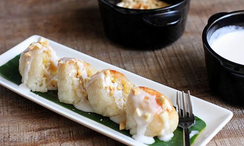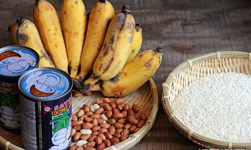 - Chuối nếp nướng thái nhỏ, ăn kèm với nước cốt dừa và đậu phộng giã hơi dập.