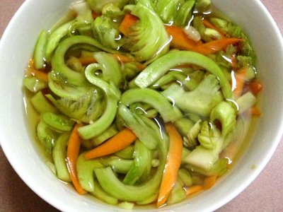 - Cho ngồng cải, cà rốt vào trộn cho đều. Thỉnh thoảng đảo đều cho ngấm. Trời nóng thì sau 2 ngày có thể ăn được, trời lạnh phải sau 3 ngày mới ngấm. Mới ăn có thể hơi có vị hăng, cay cay nhẹ.