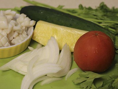 - Dứa thái lát vừa ăn; Cà chua thái múi; Dưa leo bỏ ruột, thái xéo; Hành tây thái múi nhỏ.