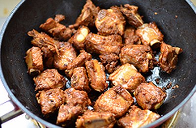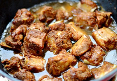 Cho nước xâm xấp mặt thịt, thêm xì dầu và nước màu vào rồi đậy nắp, đun khoảng 20', đến khi nước sốt cạn bớt và sánh lại.