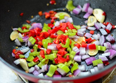 Rửa sạch rồi xắt nhỏ hành tây, tỏi và ớt thành hạt lựu. Trong 1 chảo khác, bạn cho hành tây và tỏi vào phi thơm, sau đó đến 2 phần ớt chuông và ớt tươi.