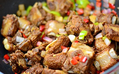 Đảo đều cho đến khi các nguyên liệu chín hẳn thì cho cả sườn và sốt vào. Xóc đều tay để các nguyên liệu đều nhau và ngấm sốt, sau đó tắt bếp.
