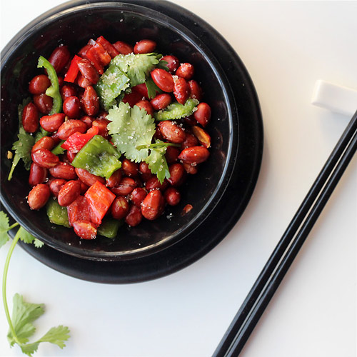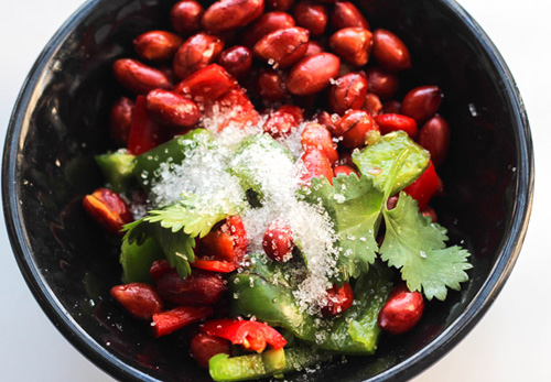 Để khoảng 20 phút cho lạc nguội, sau đó, thêm hỗn hợp sốt, ớt, đường và rau mùi.