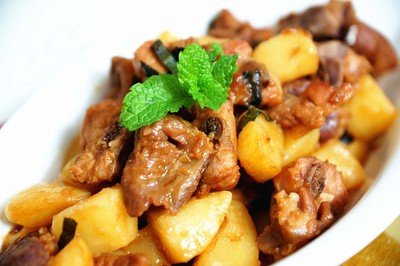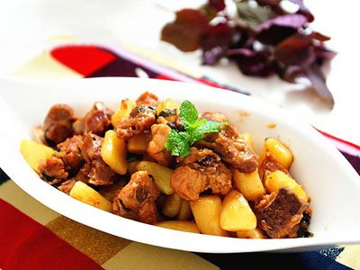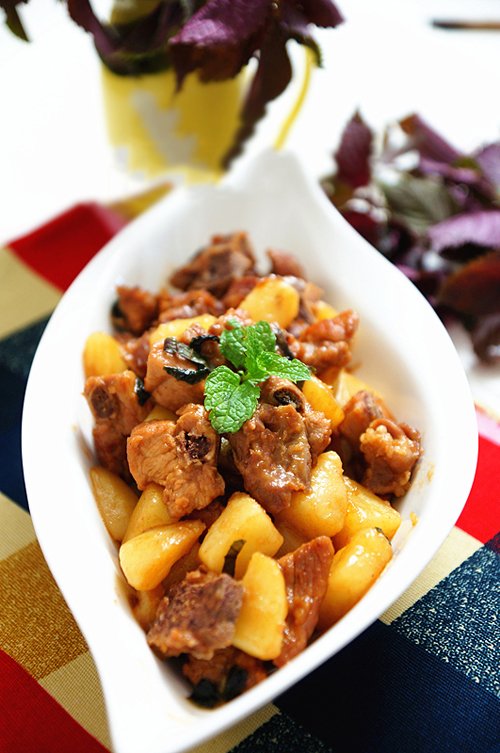 Lấy sườn kho khoai tây ra đĩa, dùng với cơm trắng.