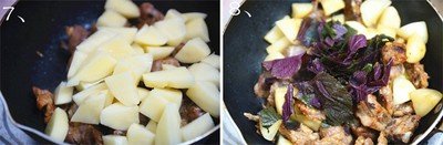 Kế đến, bạn cho khoai tây vào xào khoảng 3 phút, thì thêm lá tía tô xắt nhỏ vào.