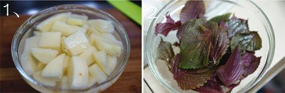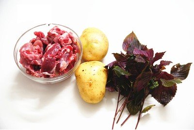 Gọt bỏ vỏ khoai tây, cắt miếng vừa ăn, sau đó ngâm nước để khoai không bị đen. Đồng thời, nhặt lấy phần lá tía tô rồi rửa sạch.