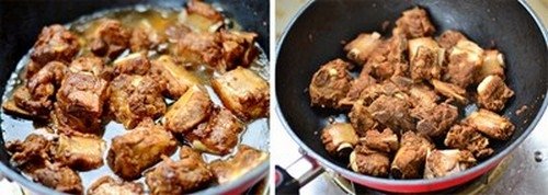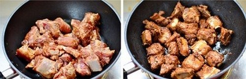 Chuẩn bị một chảo nóng với ít dầu ăn, cho sườn vào xào đến khi bạn thấy sườn hơi chín thì cho thêm nước tương vào, đảo đều.