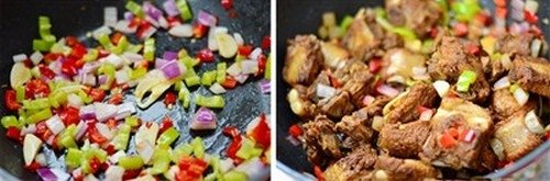 Trong một chảo khác, bạn cho ít dầu, tỏi thái lát và ớt băm vào phi thơm. Kế đến, bạn cho luôn phần ớt xanh đỏ và hành tây cắt nhỏ vào.