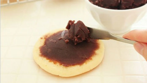 - Làm phần nhân trước để nguội này: Đậu đỏ rửa sạch, ngâm với nước khoảng nửa tiếng rồi hấp chín. Khi đậu đã bở, cho 1 thìa súp đường trắng vào ngào cùng (lượng đường tùy thuộc khẩu vị mỗi người nhé), đảo trên bếp cho và đánh tan cho đường chảy nhuyễn vào đậu. Vậy là được phần nhân, để nguội đợi vỏ bánh.