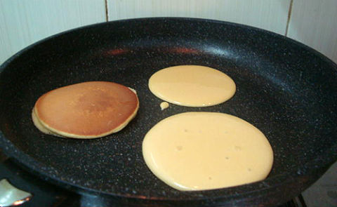 - Làm nóng chảo chống dính ở nhiệt độ thấp. Dùng một miếng giấy ăn thấm dầu thoa một lớp mỏng lên mặt chảo. Sau đó dùng giấy khô lau sạch chảo. Để lửa ở nấc nhỏ nhất, dùng muôi nhỏ, múc bột đổ từ trên cao xuống chảo để bánh tròn đều, sau đó rán bánh với lửa vừa.