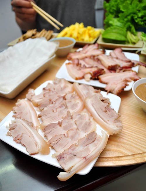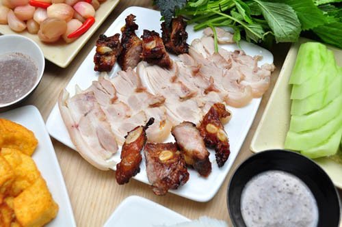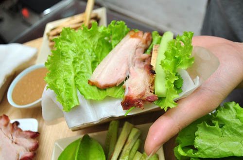 Thịt heo không những có ba chỉ luộc mà còn kèm món biến tấu là ba chỉ nướng hấp dẫn. Thịt đã tẩm ướp và được nướng trên than hoa ngay trước cửa quán, đến khi chín thơm mới thái mỏng cho khách. Món này kết hợp bánh tráng cuốn ăn rất hợp, lạ miệng và đậm đà hơn. Thịt thái không mỏng tang, số lượng cũng khá nhiều, tương đối rẻ so với các tiệm bình dân phổ biến.