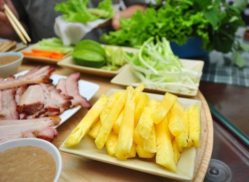 Mới nhìn suất bánh tráng thịt heo, nhiều khách hơi "choáng". Mâm gỗ to đẹp, bên trên bày cả chục bát đĩa các món khác nhau, hệt như một mâm cỗ. Tất nhiên, lúc đã bình tĩnh nhìn lại, bạn sẽ thấy đa phần toàn… rau củ quả được bày trí đẹp mắt. Bên cạnh rổ rau lớn là cà rốt, dưa chuột, chuối xanh, khế, dứa, hành đủ cả, thứ nào cũng đầy đặn.