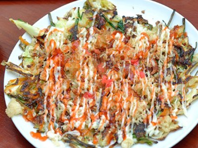 Đúng như tên gọi, món chủ đạo tại đây chính là Bánh xèo Nhật. Có lẽ giờ nhắc đến món này, nhiều người đã không còn thấy mới mẻ. Nhất là cách đây ít lâu, tại phố Ngọc Hà mọc lên một tiệm bánh xèo Nhật "phá giá" thị trường - 35.000 đồng/chiếc. Tuy nhiên, nếu đã thưởng thức, bạn sẽ biết tiệm này chỉ có một loại bánh xèo duy nhất được làm từ rau bắp cải cùng khoai mỡ, thịt heo, có độ dày nhất định, làm chín bằng hơi nên xốp xốp, mềm mềm. Còn ở quán trên phố Trấn Vũ, cũng là món bánh xèo ấy nhưng lại phong phú hơn với 3 loại nhân: gà, heo, hải sản. Hơn nữa, tại đây có dòng "bánh xèo đặc biệt", với nguyên liệu và cách chế biến thú vị, ngon miệng hơn. Tất nhiên, giá cũng nhỉnh lên chút xíu - 45.000 đồng/chiếc. Và theo đánh giá của nhiều khách hàng, trong serie bánh đặc biệt thì bánh xèo nhân hải sản là thứ đáng đồng tiền bát gạo nhất.