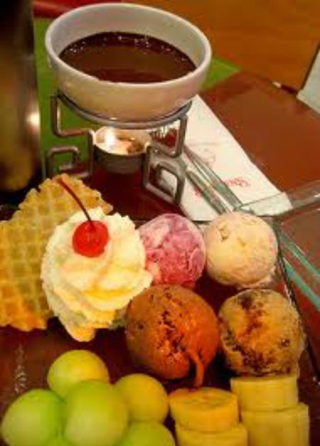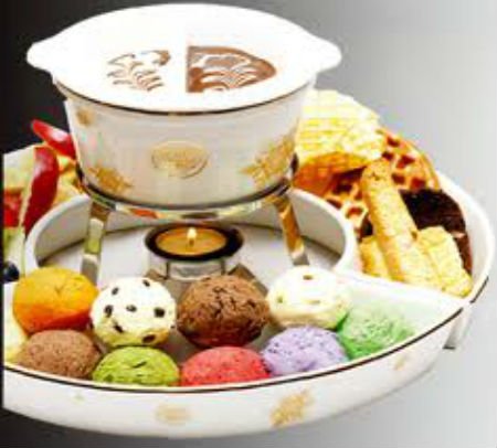 Một bát sốt chocolate đun nóng trên ngọn nến, xung quanh là đồ nhúng gồm bánh quế, hoa quả và các viên kem đủ màu chắc chắn làm nên món “lẩu chocolate” ngọt ngào trong đêm tình nhân.