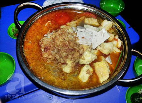 Cảm quan đầu tiên khi nồi lẩu được đưa ra là rất ngon mắt với nhiều gạch cua, hành phi. Nước dùng ở đây có lẽ được nấu từ rất nhiều cua nên khi nếm thử, bạn sẽ cảm nhận được vị thanh ngọt xen lẫn chút tanh chuẩn vị cua chứ không phải vị ngọt của nước xương. Vị ngọt thanh của cua quyện cùng vị chua dịu mà thơm của giấm bỗng tạo thành thứ nước dùng vô cùng thuyết phục và giúp cho đồ ăn kèm thêm hấp dẫn, đậm đà.