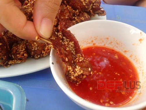 Vịt chiên vừng được chiên kĩ hơn vịt rang muối nên nhìn một đĩa nửa con khá "ngót". Dẫu vậy, nhìn từng miếng vịt nâu óng, tẩm lớp vừng vàng rộm là đã thấy thơm tho, hiếm ai có thể chối từ.
