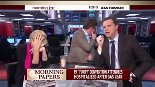 Trên bản tin của Morning Joe của kênh NBC, những người dẫn chương trình đã phải cố nhịn cười và quay mặt đi khi đưa tin.