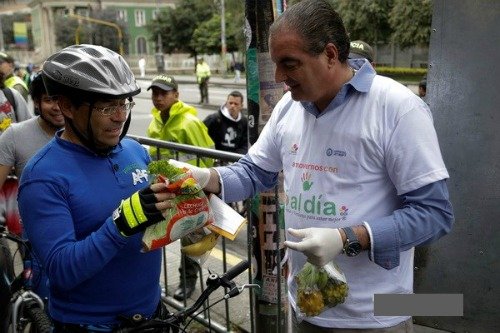 Bộ trưởng Bộ Nông nghiệp Colombia Aurelio Iragorri phát rau miễn phí cho người dân ở thành phố Bogota ngày 19/10.