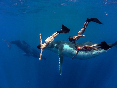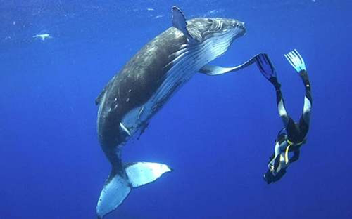 Sau khi xác định vị trí của cá voi, người lái thuyền chạy cách xa 100 mét để bảo đảm sự an toàn cho con vật, tắt máy và thả một sợi dây neo. Các thợ lặn nhảy xuống và rất nhanh chóng, với sự tò mò bẩm sinh, những chú cá voi liền bơi lại gần để “chào hỏi” đoàn khách.