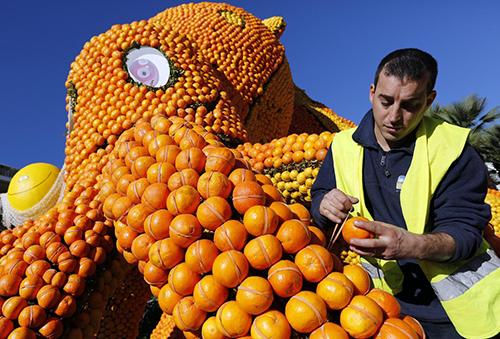 Không chỉ có chanh, những quả cam đẹp nhất, với sắc màu rực rỡ cũng được sử dụng để tạo nên những tác phẩm mê hồn từ chanh. Để hoàn thành những kiệt tác từ hoa quả này, những nghệ nhân của thành phố Menton đã phải chuẩn bị từ rất sớm trước đó, từ khâu chọn lựa cam, chanh chín tới trong vườn tới lên ý tưởng, thực hiện và hoàn thành ý tưởng.