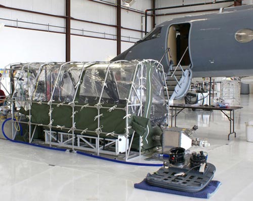 Thiết bị cô lập bệnh nhân trong chuyên cơ Gulfstream được gọi là Hệ thống cách ly sinh học hàng không (ABCS). Mỗi thiết bị ABCS trông giống như một chiếc lồng lớn, trong đó, áp suất không khí luôn ở mức thấp hơn bên ngoài và các nhân viên y tế khi vào trong các thiết bị này chăm sóc bệnh nhân không cần phải mặc đồ bảo hộ.