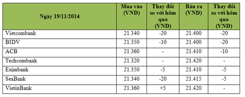 Hầu hết các NHTM đều giảm 5-20 đồng/USD cả giá mua vào và bán ra so với cuối ngày hôm qua. Vietcombank điều chỉnh mạnh nhất khi giảm 20 đồng/USD. Giá mua vào và bán ra tính đến đầu giờ chiều 19/11 của các ngân hàng phổ biến ở mức 21.340-21.360 đồng/USD và 21.400-21.420 đồng/USD. Tỷ giá bình quân liên ngân hàng vẫn duy trì ở 21.246 VND/USD, tỷ giá tại các sở giao dịch của NHNN là 21.200 - 21.2400 VND/USD.